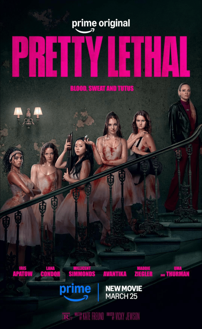 That’s why it was so serendipitious that a new horror movie, Pretty Lethal, had come to Prime Video to stream. I was very intrigued. Not simply because of the premise (mixing dance and horror/gore? count me in!) but the cast is also stacked. Uma Thurman, Maddie Ziegler, Iris Apatow, Lana Condor, and Millicent Simmonds were all names I recognized. I really wanted to see them all dance! I went into the film completely blind to the plot and any potential violence that would be in it so that I would have a pure reaction when I saw it.